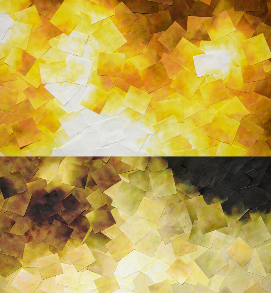 映像や写真から切り取られた小さな紙片を幾重にも貼り合わせて