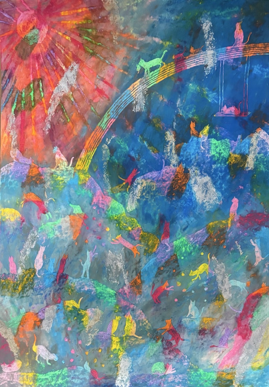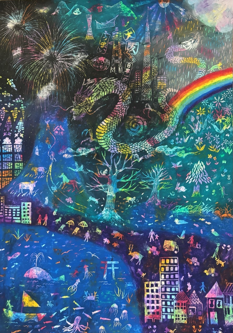 カラフルで美しいクレパススクラッチの世界!高層ビルの摩天楼や、動物たち、虹や龍に至るまで、丁寧に細かく描かれており、夢見るような世界へと誘ってくれます。星座のシリーズも素敵ですね。「ドリル」の会の皆様とのグループ展の写真も賑やかで、楽しみながら仲間とアートに取り組んでおられる姿が素敵です。