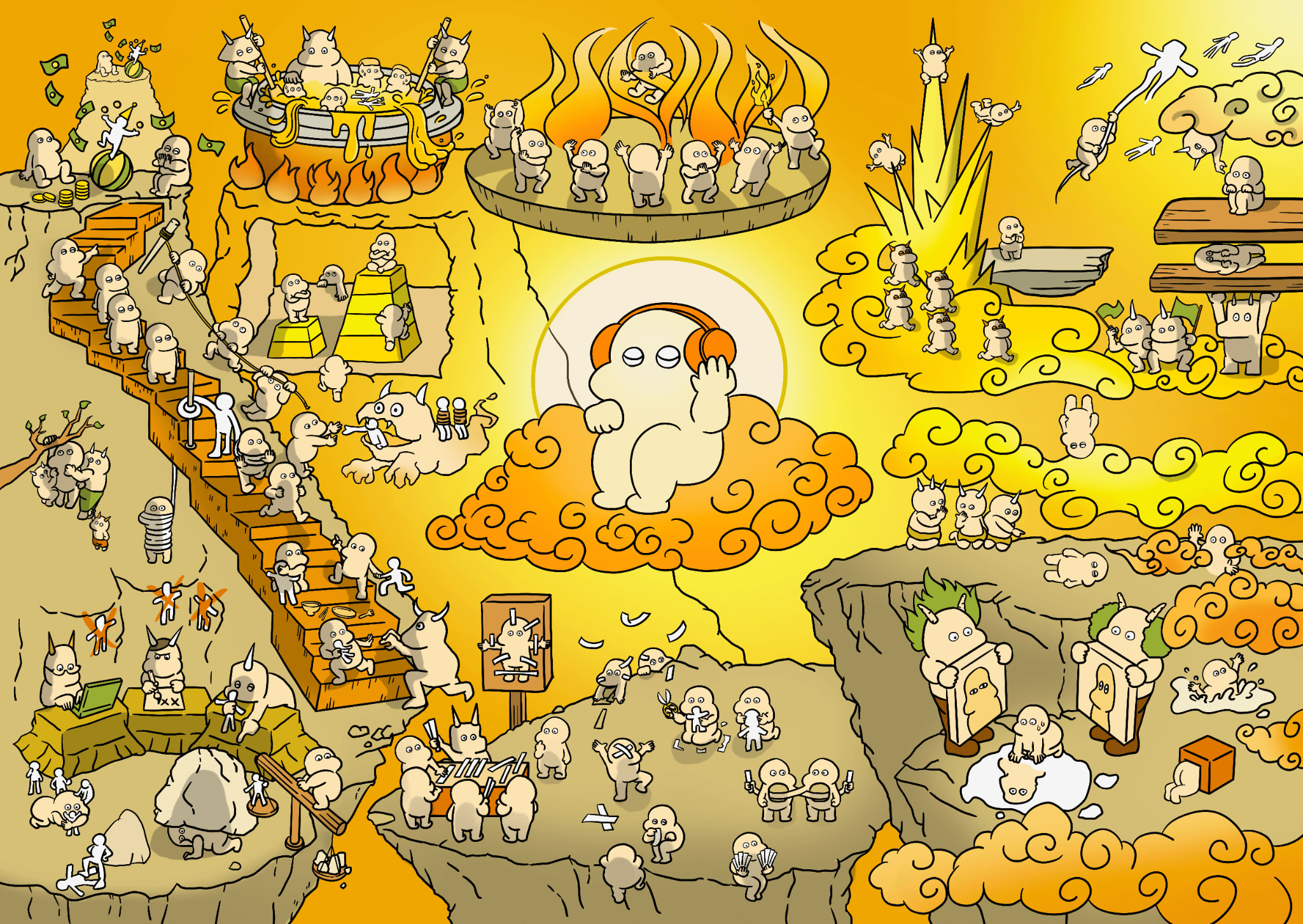 ブラックユーモアが込められた地獄絵図の周りに人々が集まると、会話は笑いと相互理解へと発展します。「私も同じ気持ち!」「私だけかと思った!」地獄絵図は、他の媒体ではできない方法で、難しいテーマを軽妙に共有することを可能にします。