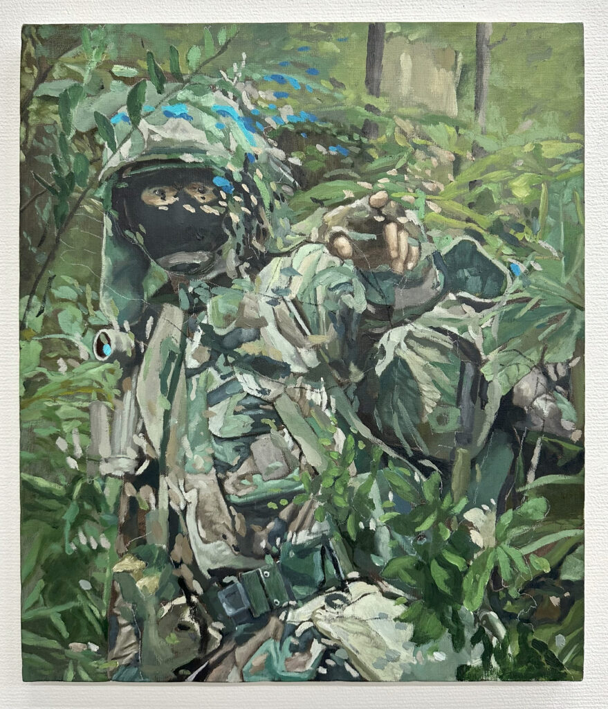 バグやブレといったデジタルのような画風を用いて「コンテンツとしてのミリタリー」を油彩で描いている。