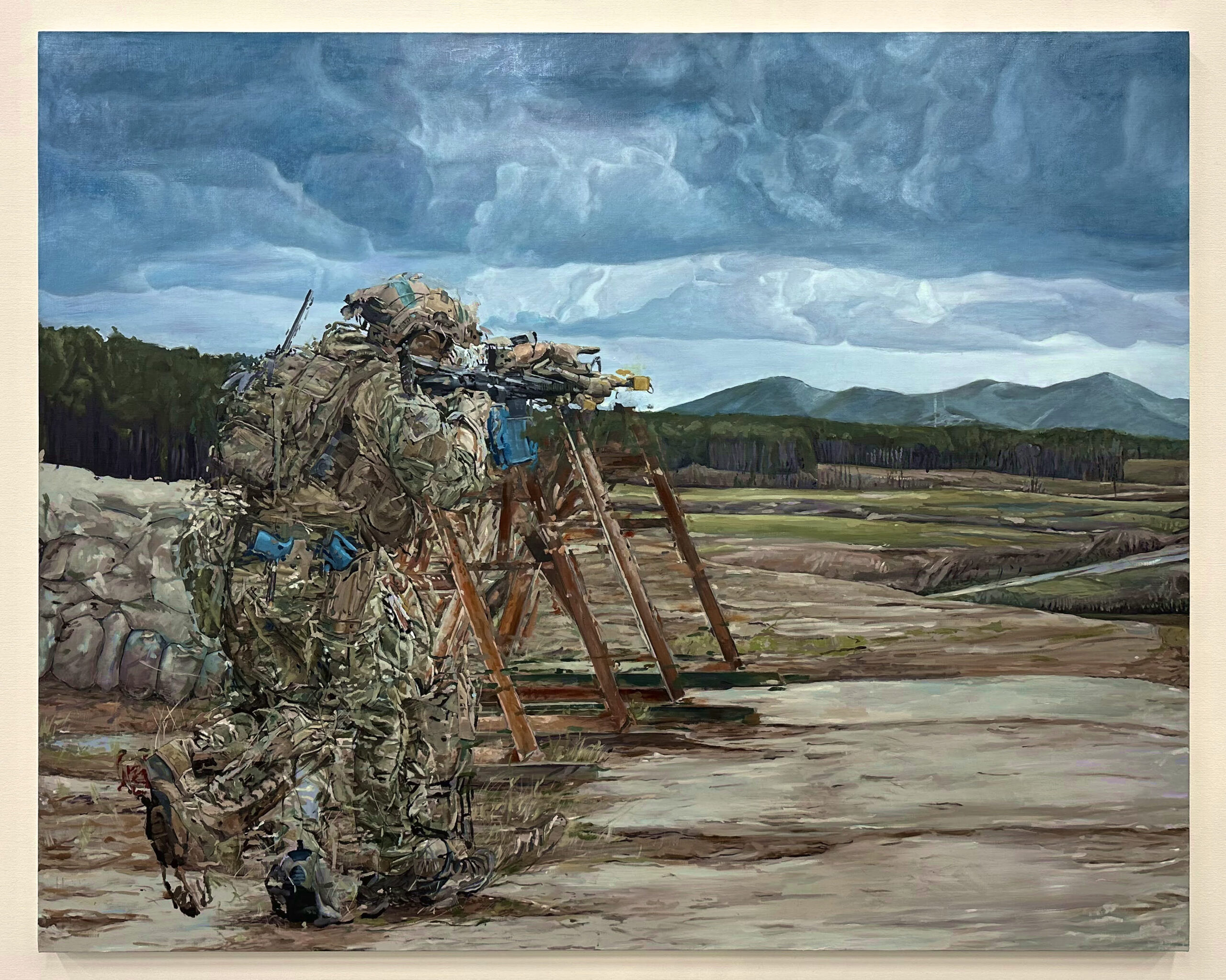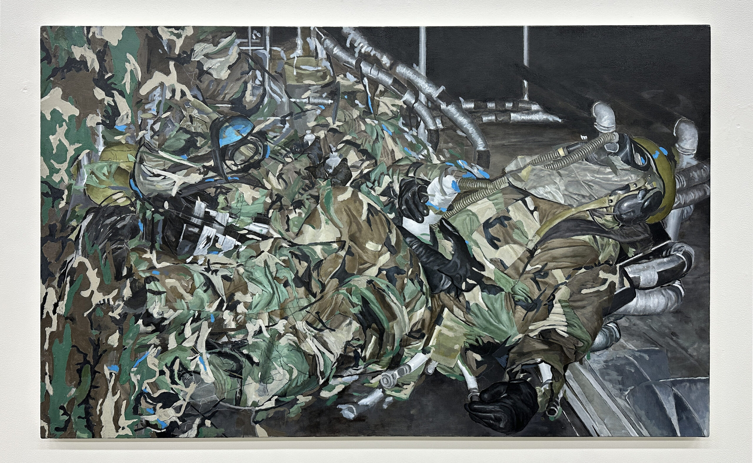 バグやブレといったデジタルのような画風を用いて「コンテンツとしてのミリタリー」を油彩で描いている。